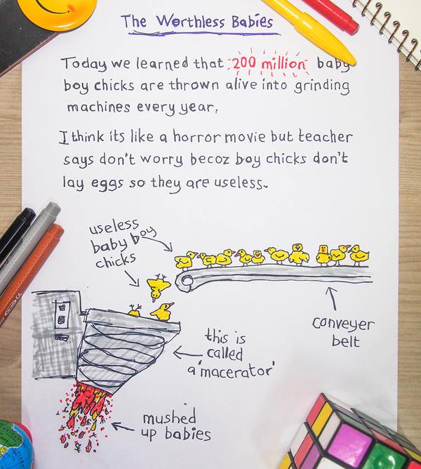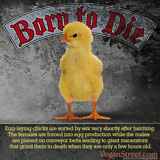 The hens that lay eggs go through "forced molting", which translates as giving her no feed for seven to fourteen days at a stretch, causing her reproductive cycle to reset. They are forced to undergo this process several times during their life, which is cut dreadfully short; she will live two years or less, until her body is exhausted from the stresses of constant laying and her egg production decreases. When you consider that she would live to be eight to ten years if left to her own devices, she is essentially killed as teenager.