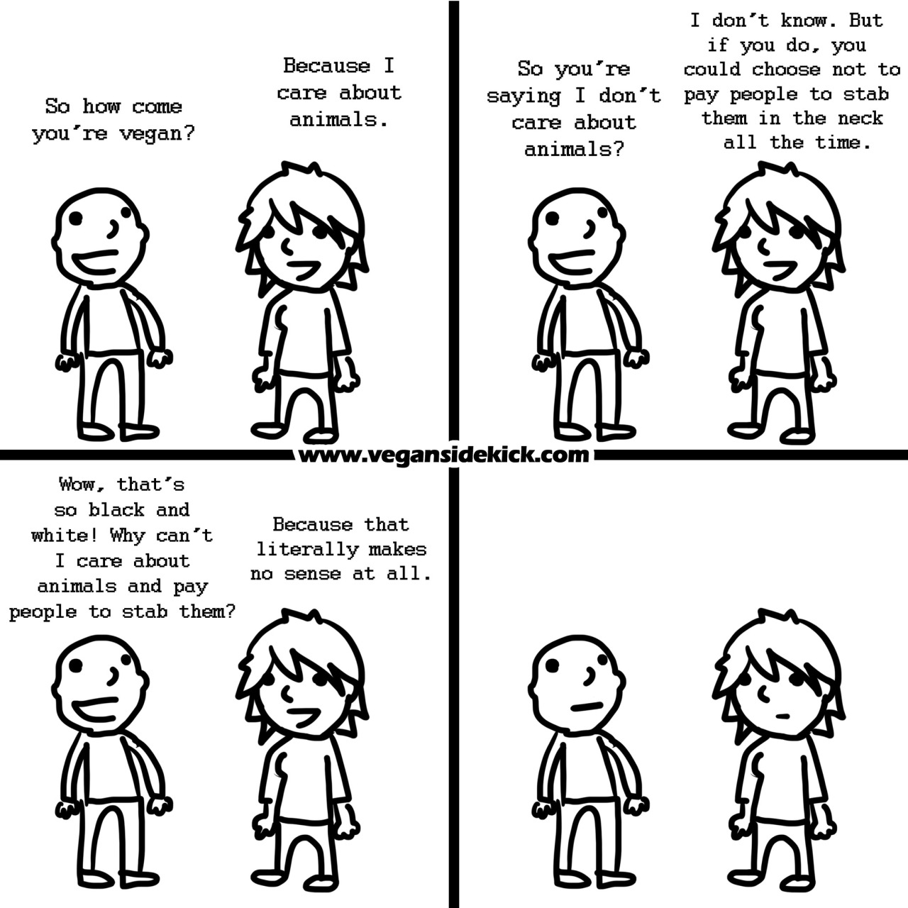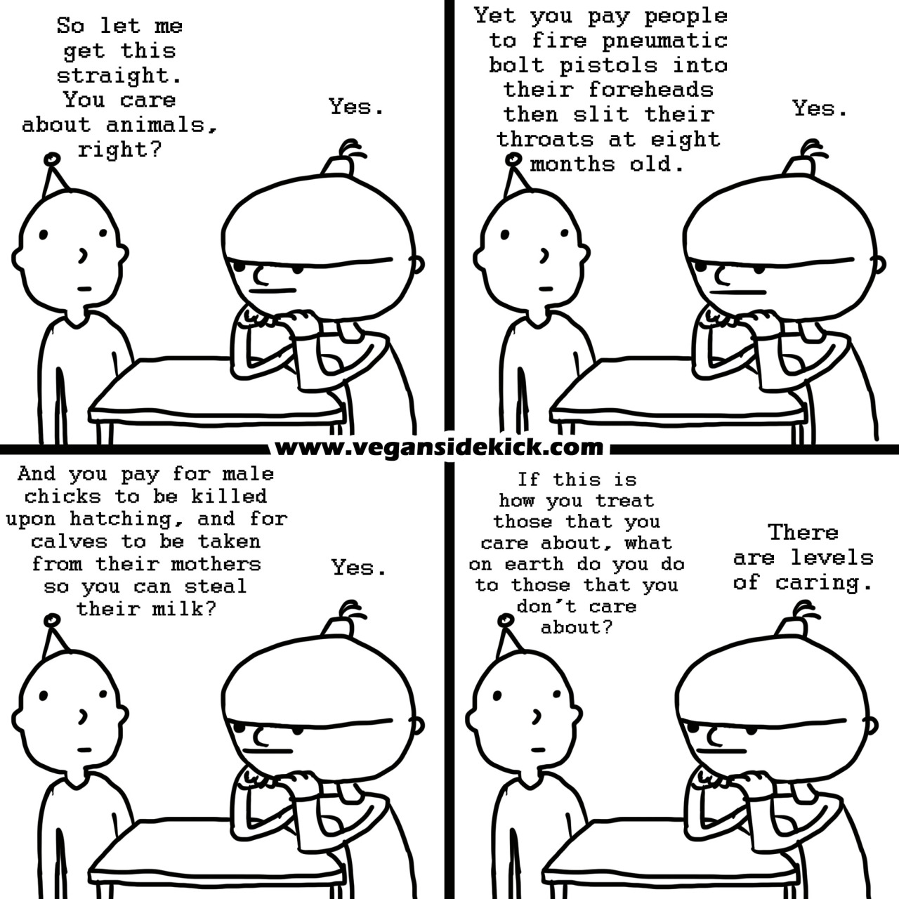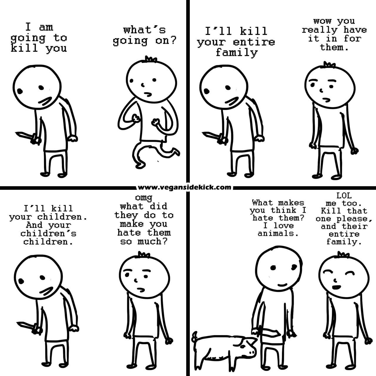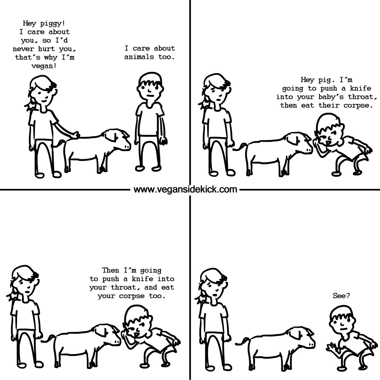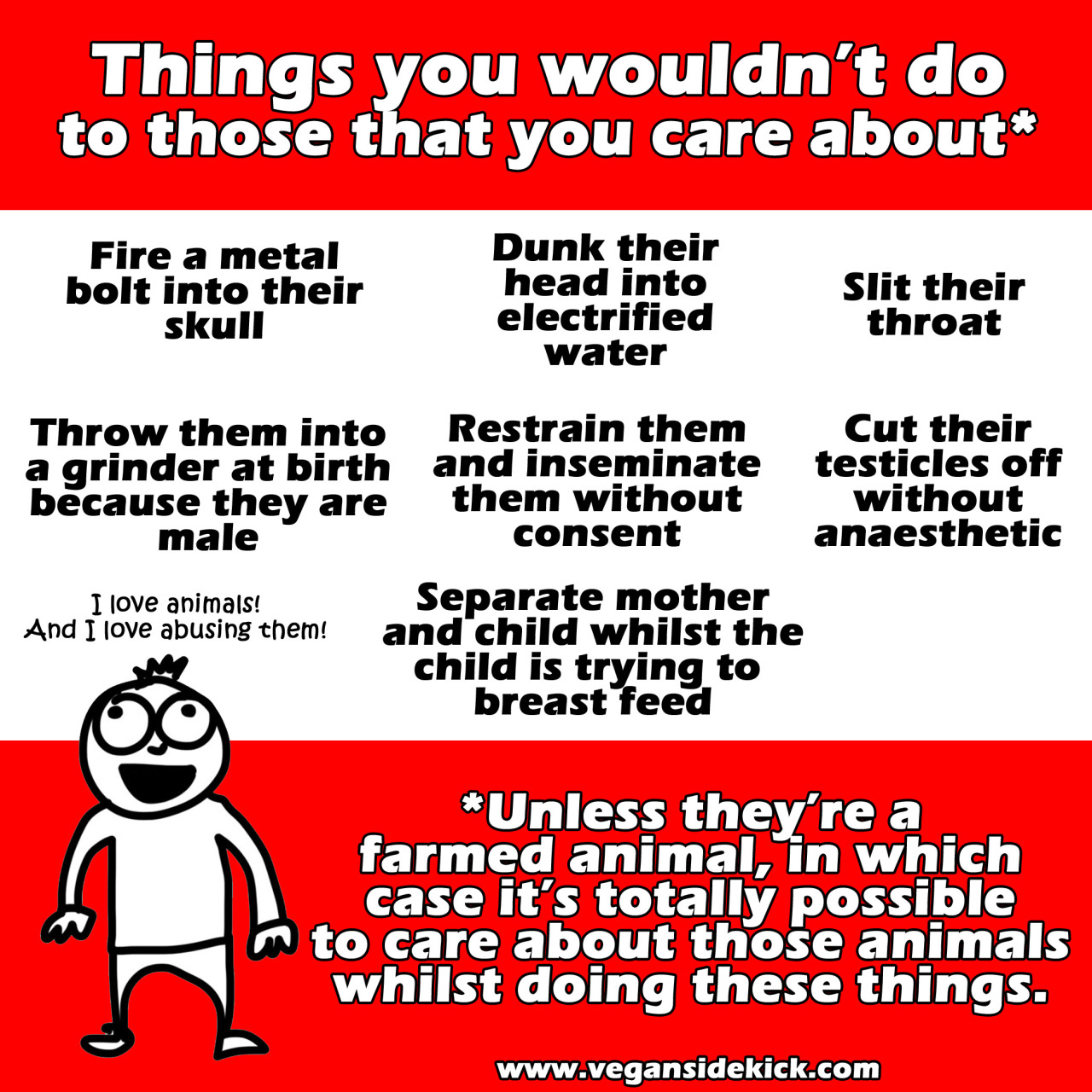 If, on the other hand, a person knows exactly where meat comes from and also knows that we don't need to eat it, they simply cannot call themselves an animal lover. You can't love somebody and willingly eat them too. "Animal lovers" who eat meat are really just "some-animal-lovers". They love the "cute" animals, the "pretty" animals... the animals society deems deserving of love. You're not an animal lover if you care solely about dogs, cats, and bunnies.