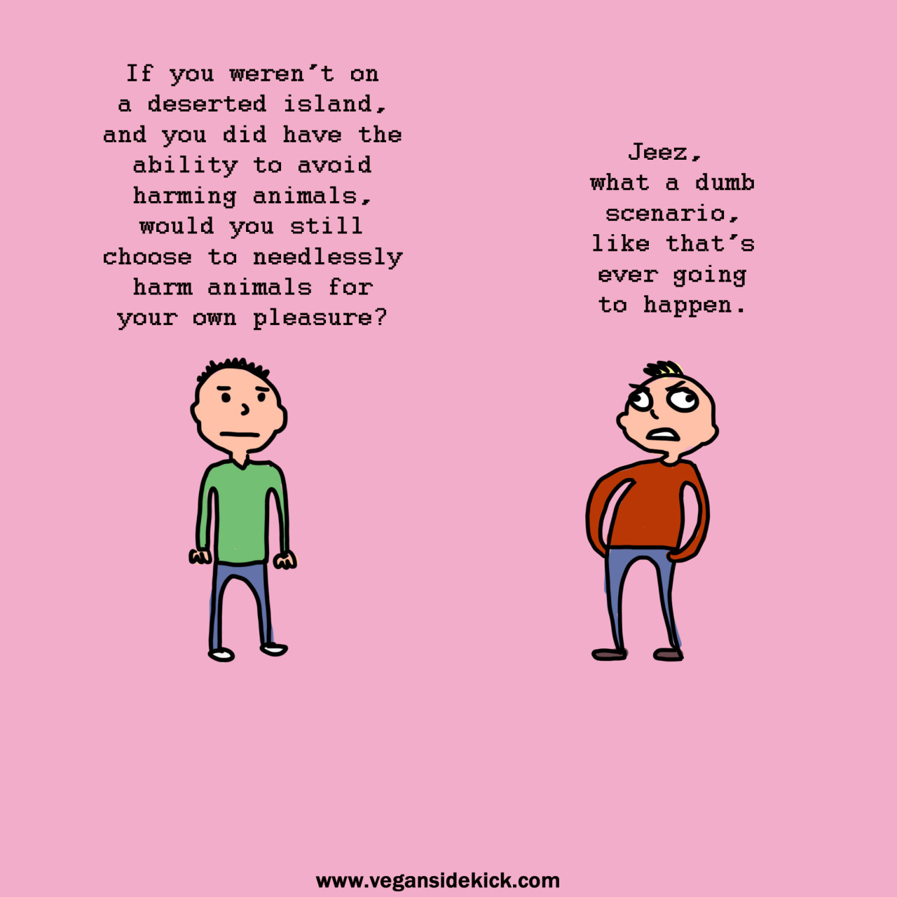 As vegans, we are commonly asked the “deserted island” question. “Sure, you’re vegan, but what if you were stranded on a desert island…what would you eat then?” The simple answer is, “Whatever plants the animals are eating.” To take this a step further, I’d like to pose that those same people answer this question: if a toddler was placed on an uncharted island with abundant wildlife and plant life, would the child grow up a vegan or a meat-eater?